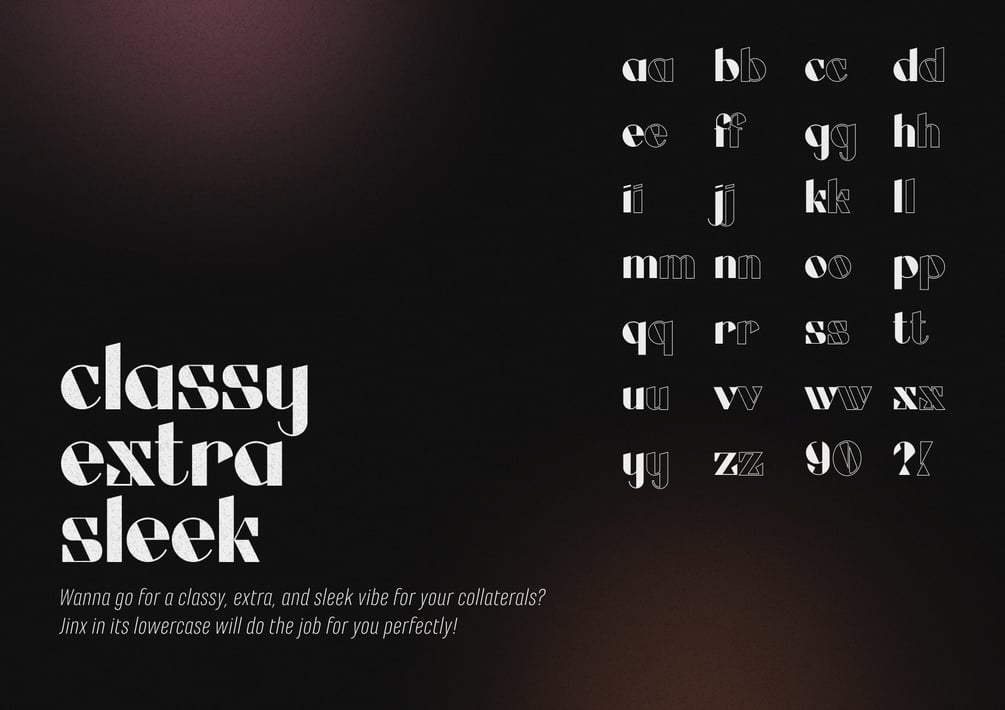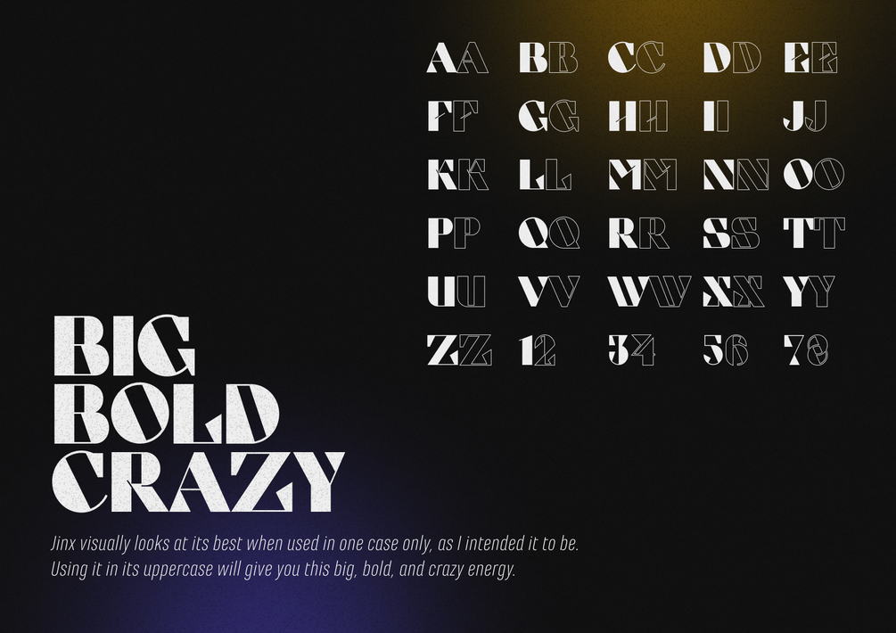 Jinx is a high contrast display typeface formed through various combinations of sharp-edged shapes, curves, lines, and angles.